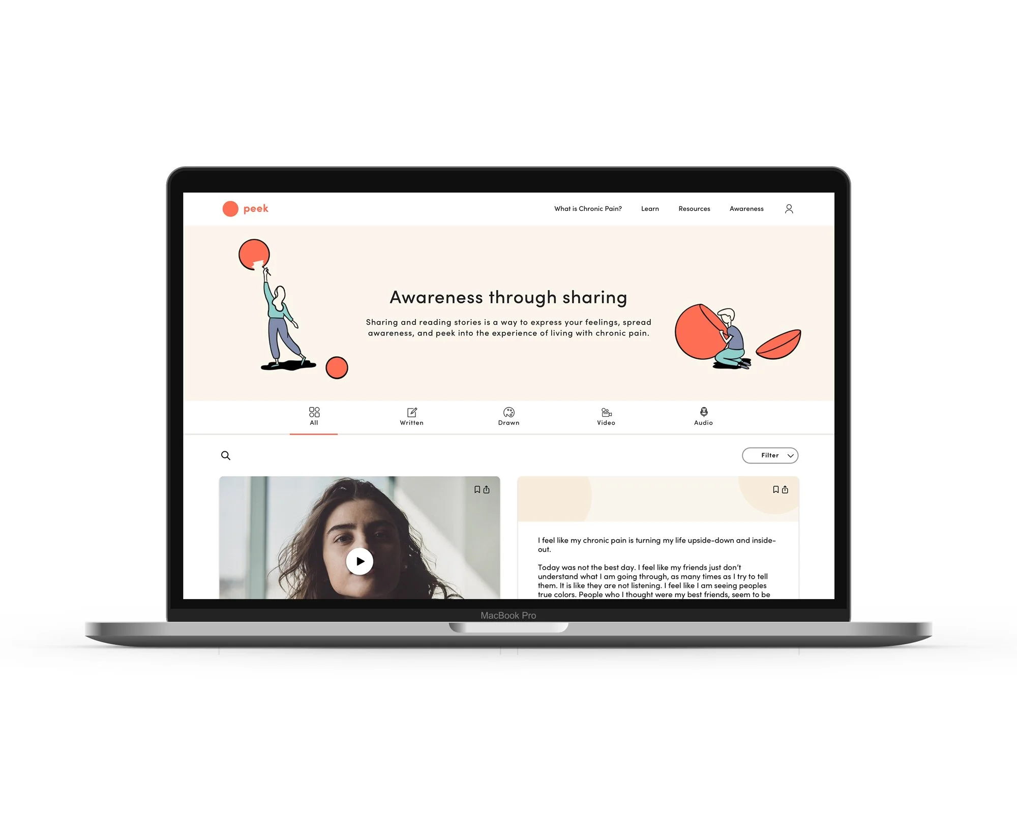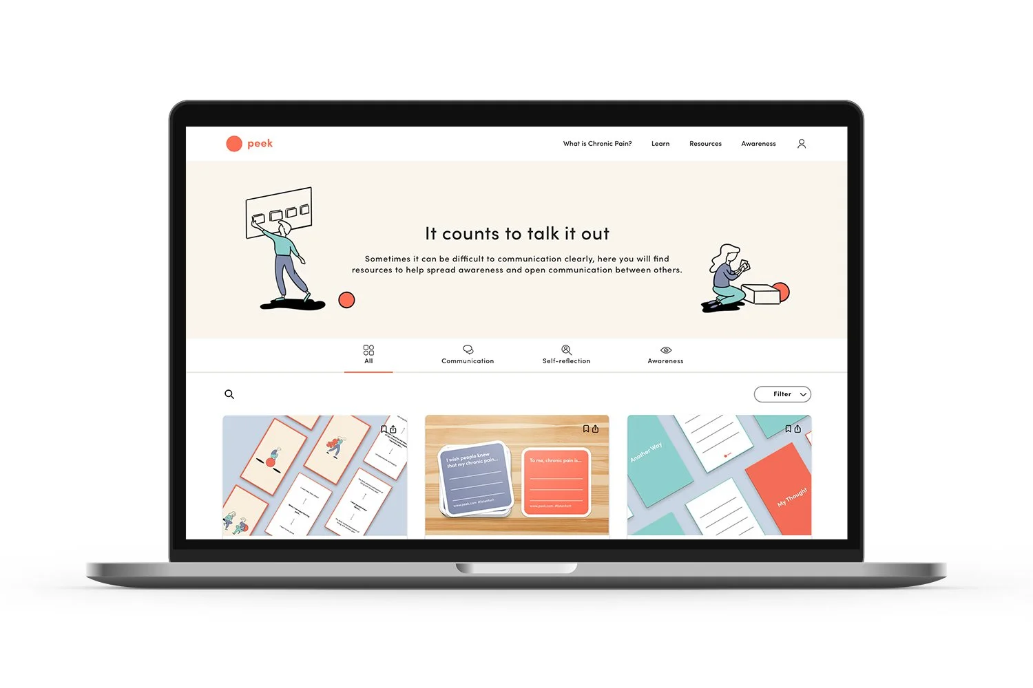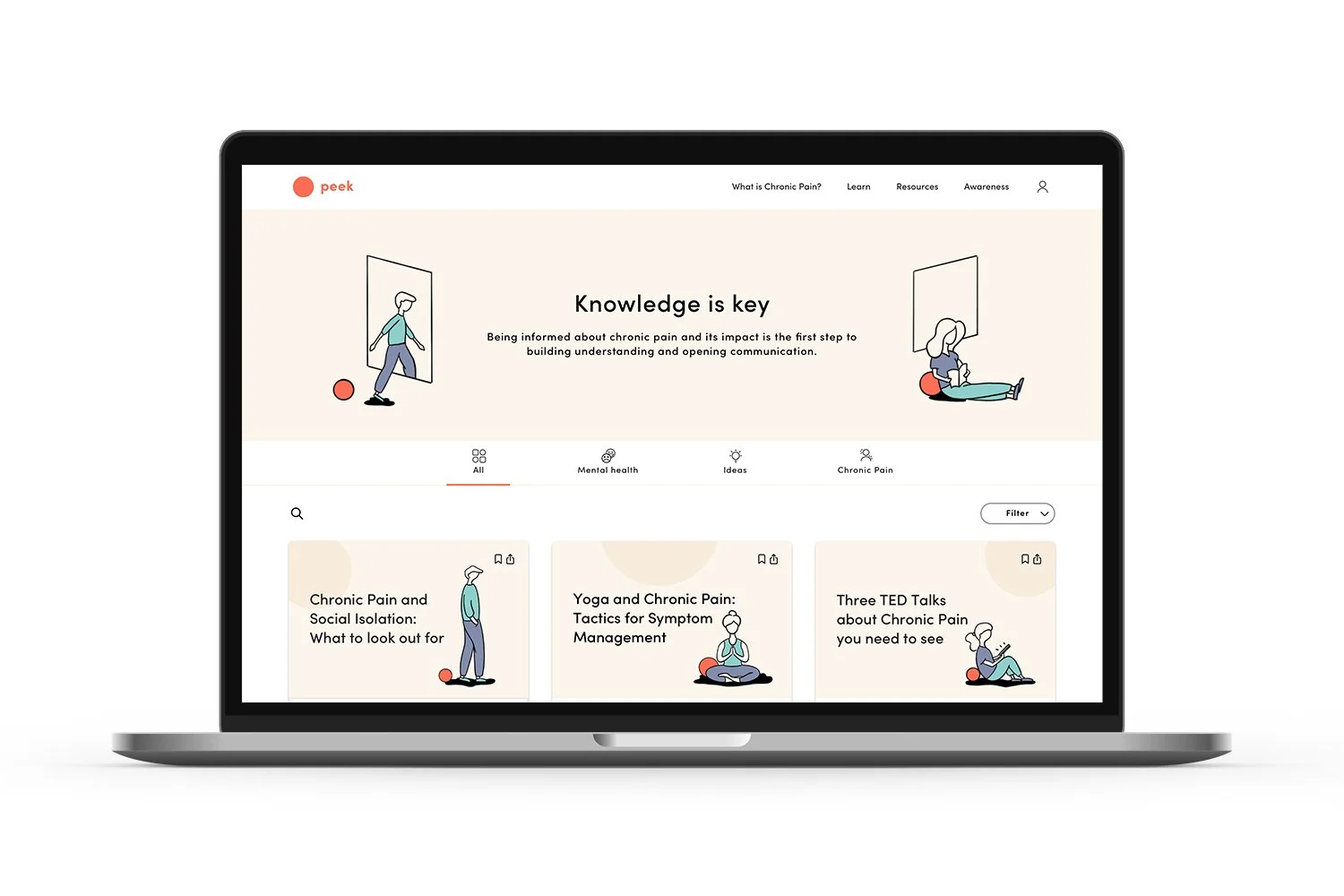 The Peek website features public articles about chronic pain, its mental effects, and ideas/perspectives about chronic pain. This is the first step in building understanding and opening communication around chronic pain.