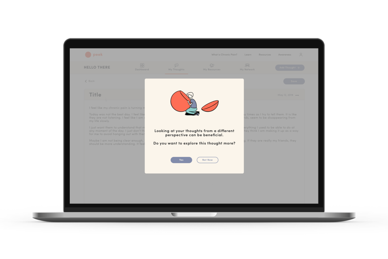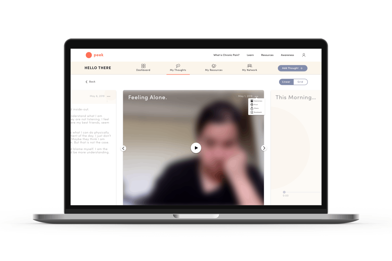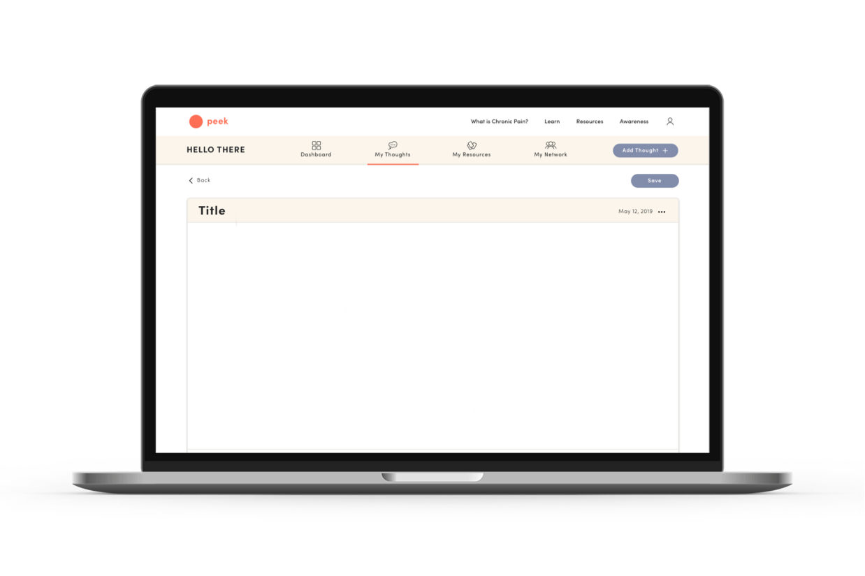 Peek has two main elements: (1) The website features free resources, information, and shared stories that are accessible without signing up. (2) The platform is a resource to help chronic pain patients and their family/friends record their thoughts, build a collection of resources, and share them.