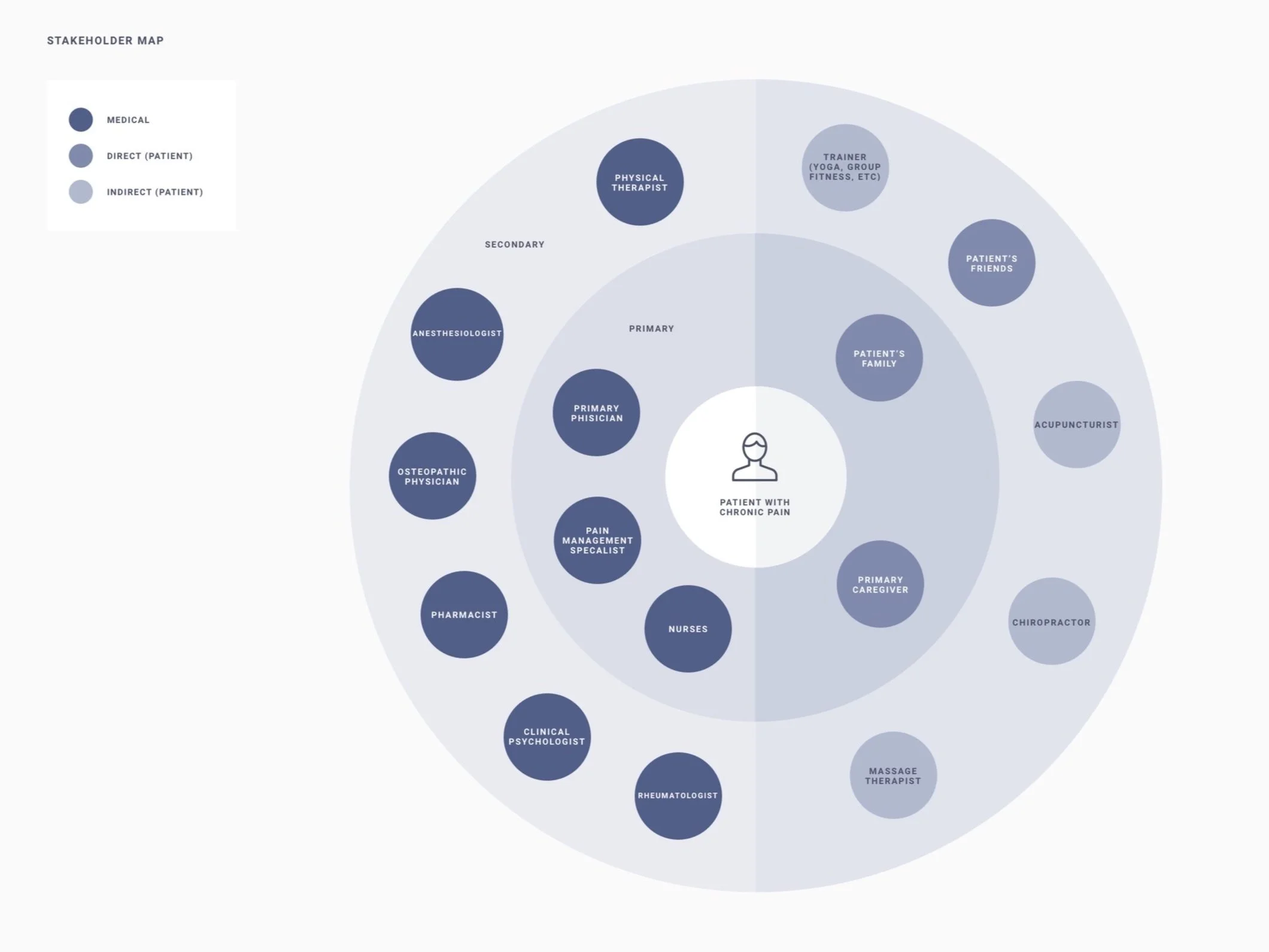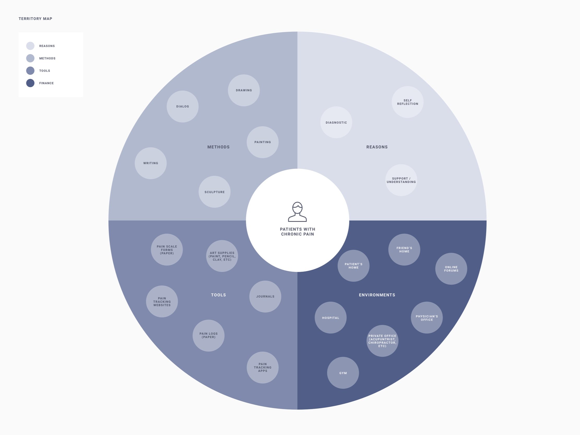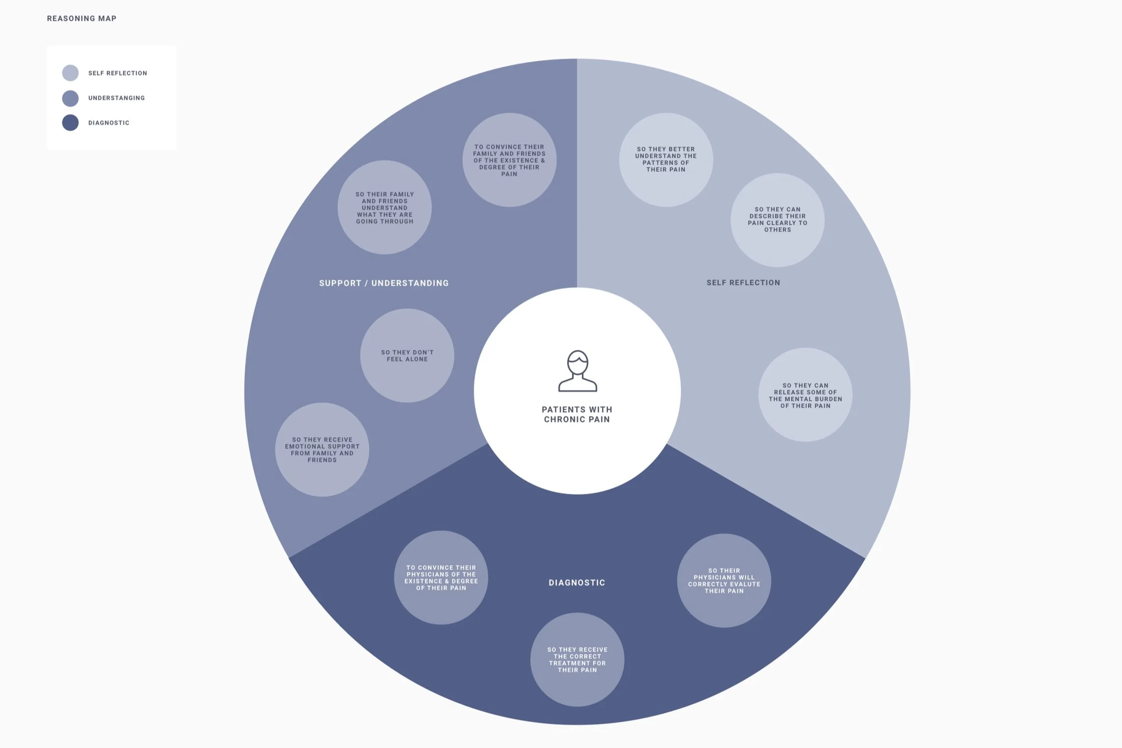 To tackle this challenge, I conducted market research and in-depth interviews and utilized online patient forums to understand the patient experience and perspective. I broke down my initial questions to help me contextualize the experience of chronic pain patients and understand the difficulties they experienced communicating with their doctors, family, and friends.